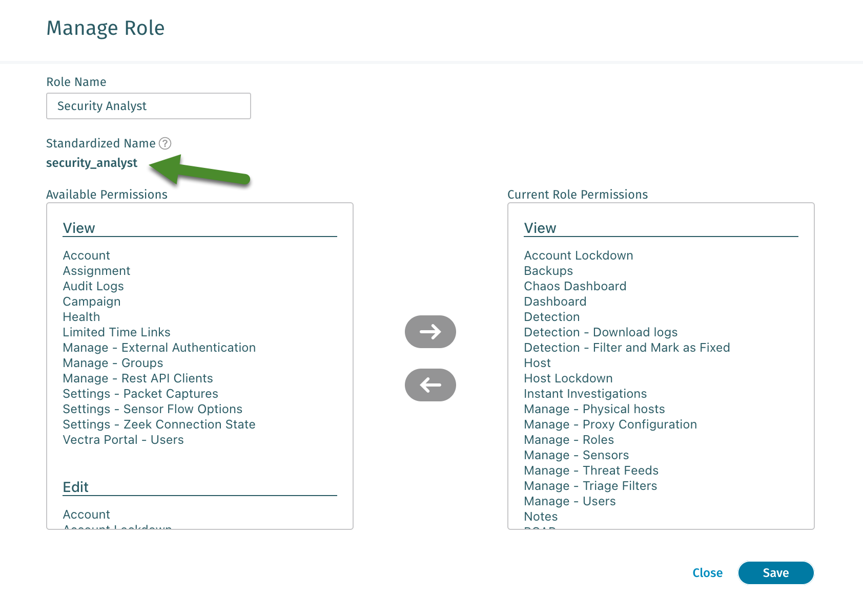 * To see the standardized role names in the Vectra UI, navigate to the *Configuration → ACCESS → Roles* screen