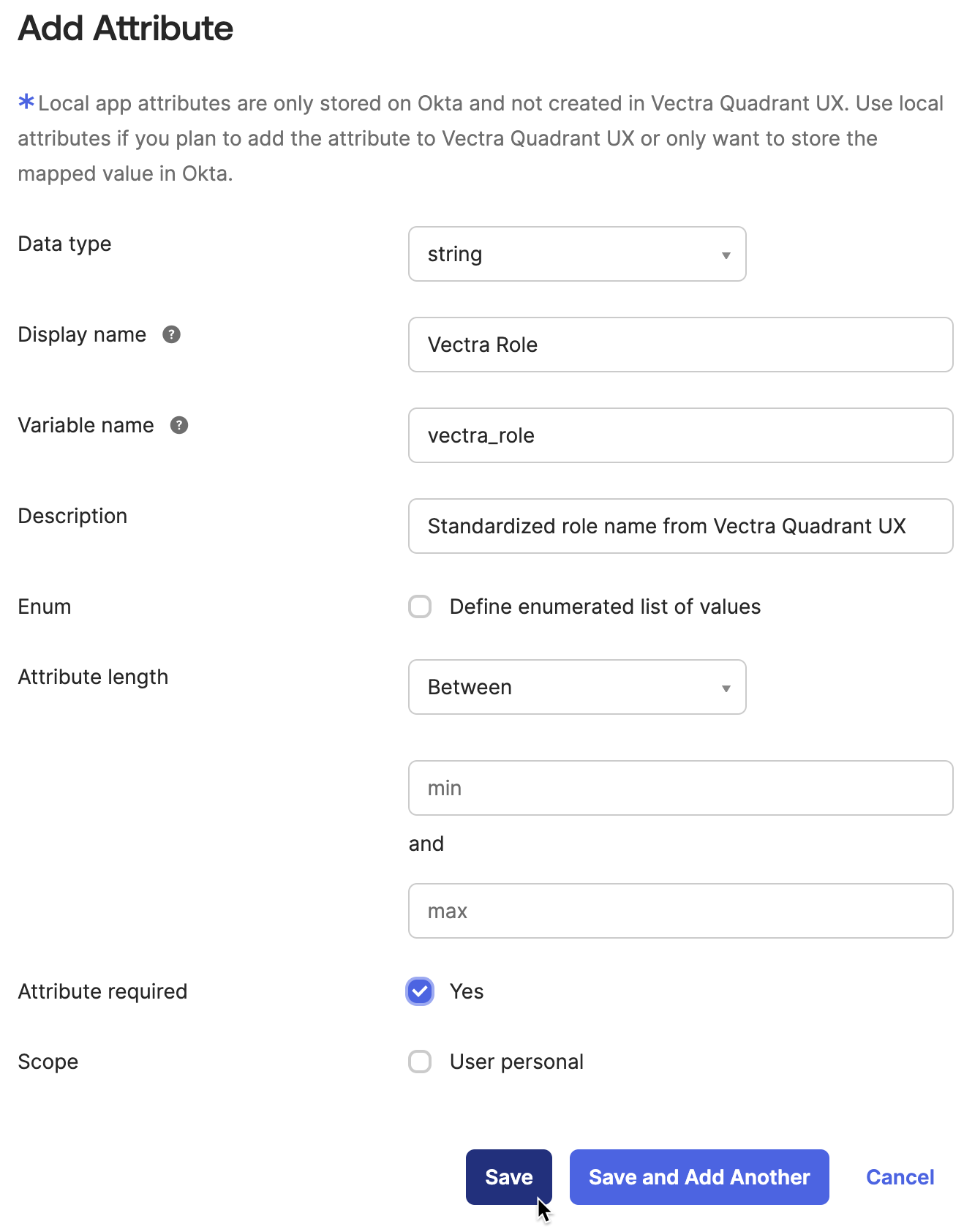 * Display name: **Vectra Role** or whatever you want to call the attribute.