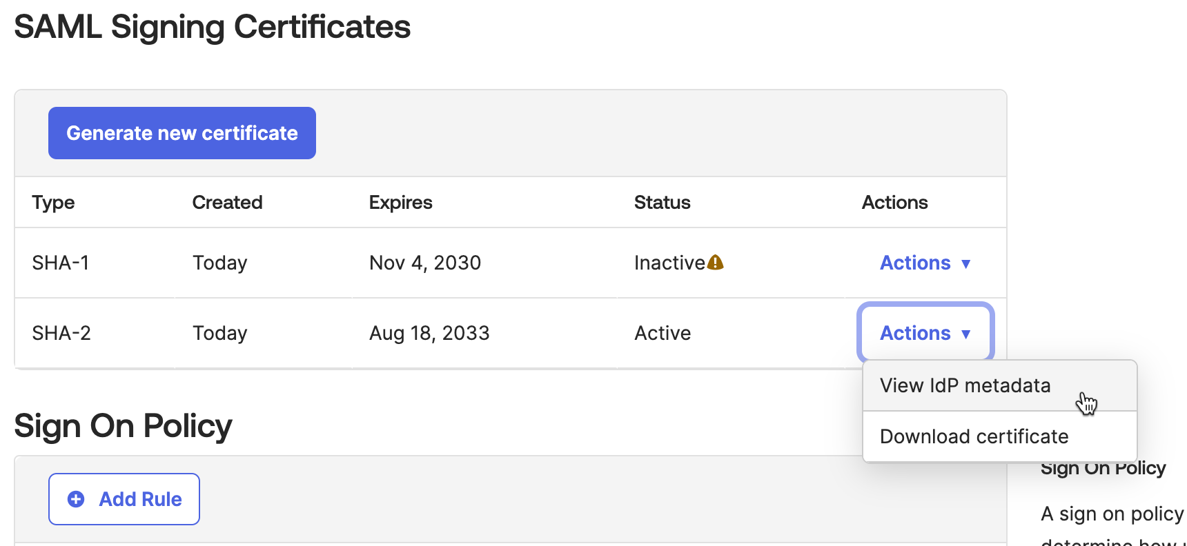 * Scroll down to the **SAML Signing Certificates** area and click on **Actions** on the right and then click on **View IdP metadata**.