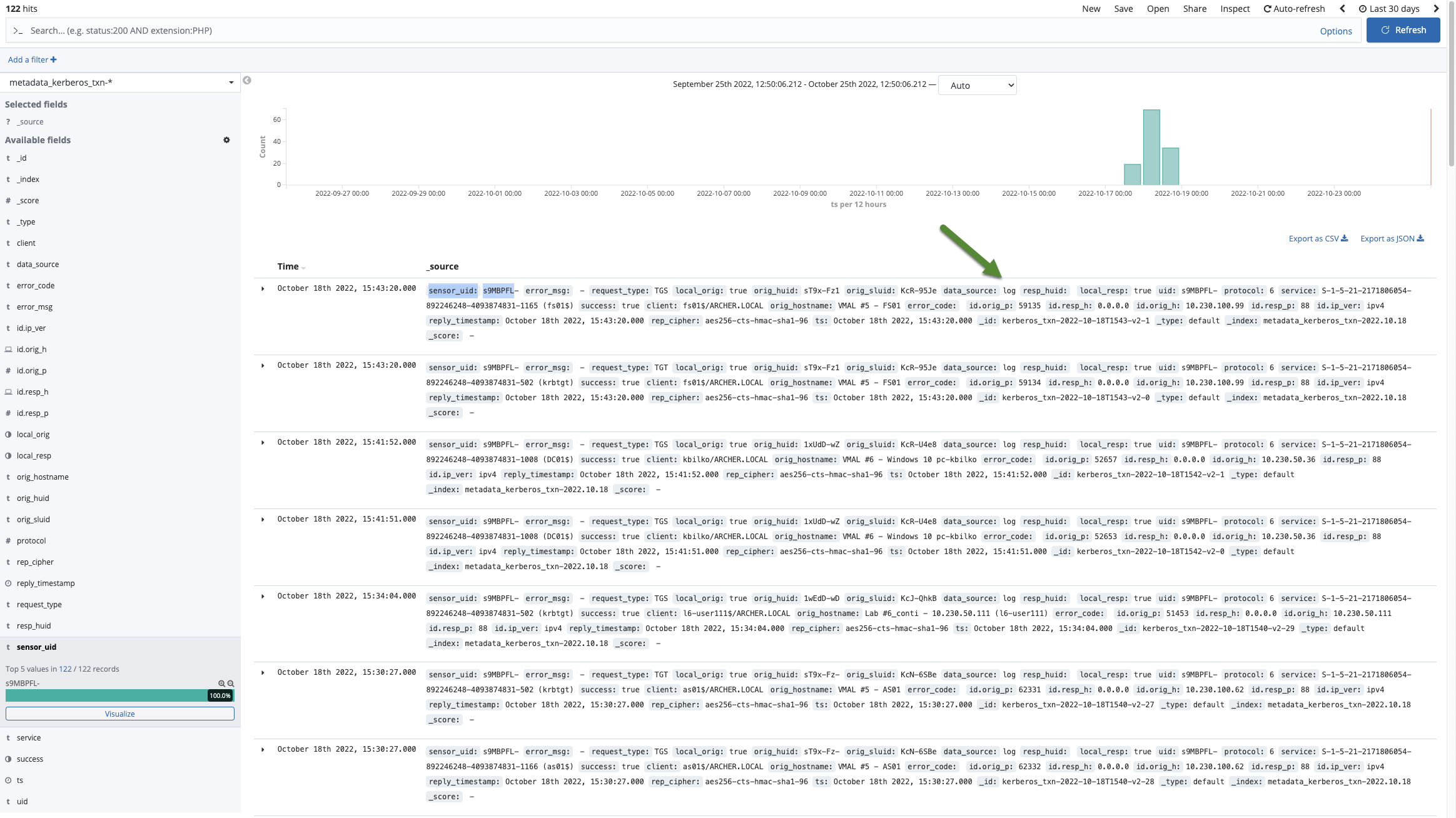 For Recall or Stream customers, the metadata\_kerberos\_txn-\* can be examined to see messages being successfully parsed shortly after ingestion. Looking for a data\_source of **log** will show successful message parsing via WELI. If you see a data\_source of **network** that indicates kerberos messages that were seen in network traffic captured by your sensors.<br>