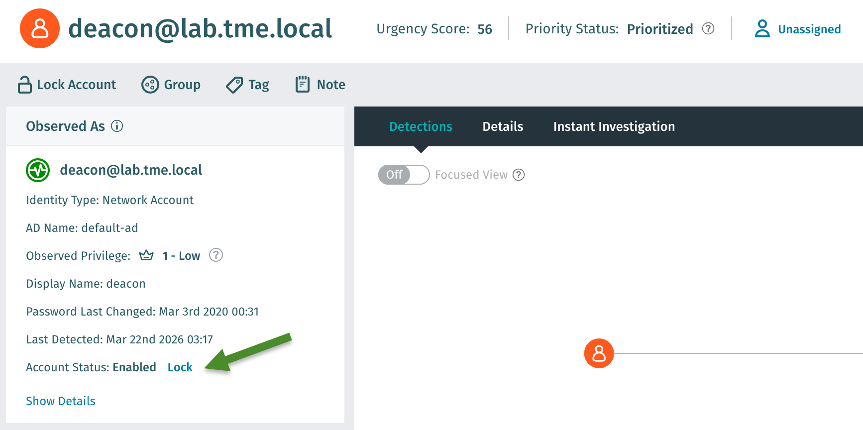 Account Lockdown enables analysts to temporarily disable network accounts during a security investigation. Account Lockdown enables enforcement action, via the disabling of Active Directory accounts.