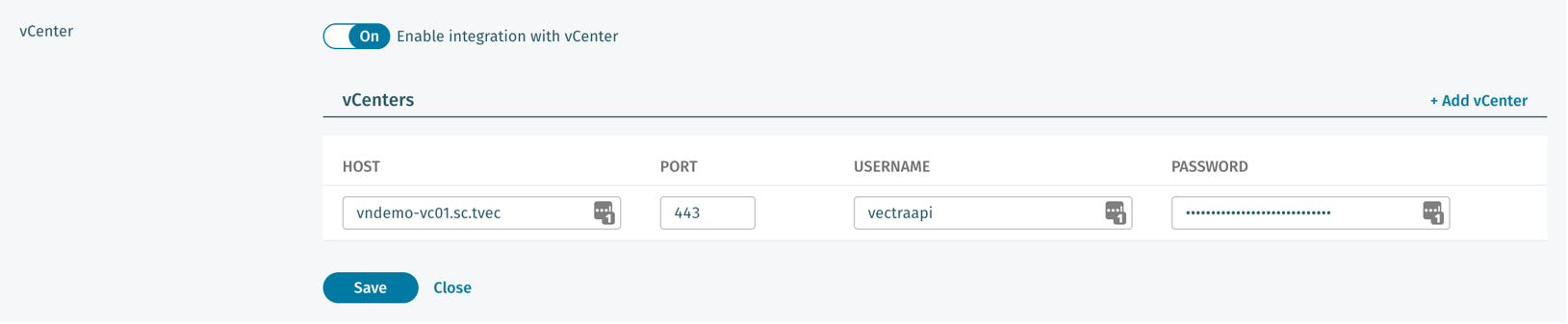 You can configure multiple vCenter integrations if you have more than one server to connect to. You will also need to have the port number, username and password. Simply repeat these steps to add additional vCenter connectors to your Vectra deployment.