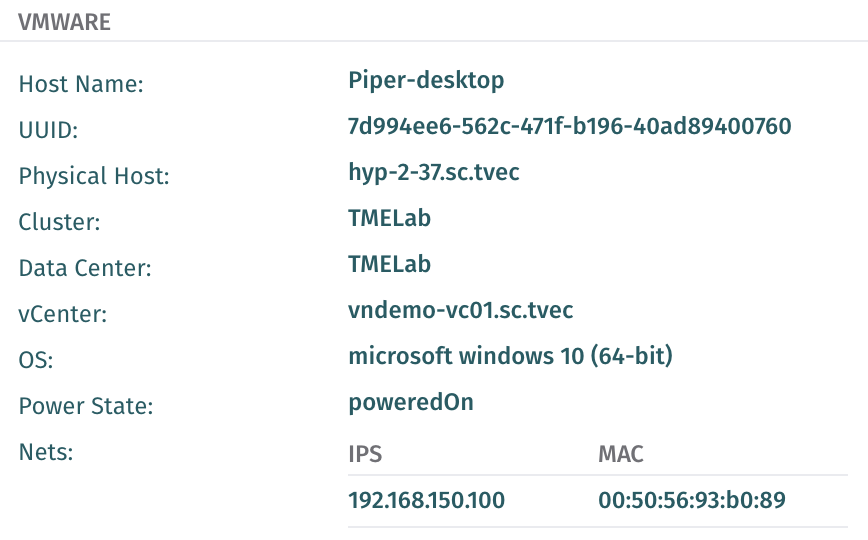 When an analyst views a Host that is running VMware tools and reporting back to vCenter/vShere with the Vectra vCenter integration enabled, additional context about the Host is available. To view this context, look at the left-hand side of the Host’s page in the Vectra UI for summary information including the VM name and operating system as reported by the vCenter API. The Host Details view has a more complete view. Below are examples of each: