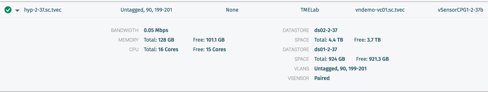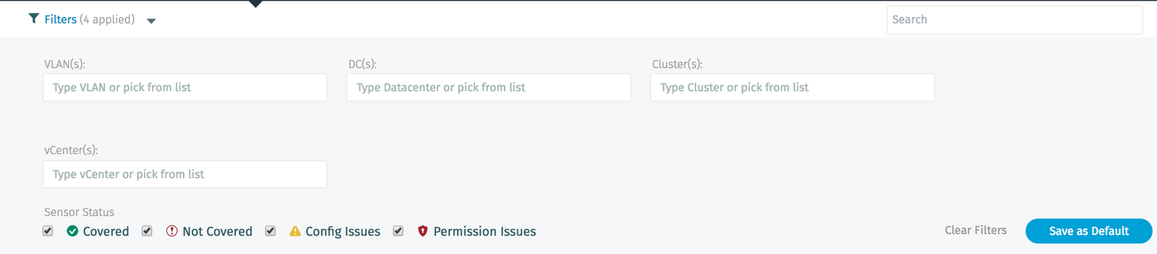 Enabling the vCenter integration also helps with vSensor deployment planning by identifying the physical hosts, clusters and data centers that currently have vSensor coverage, and those that do not have coverage.