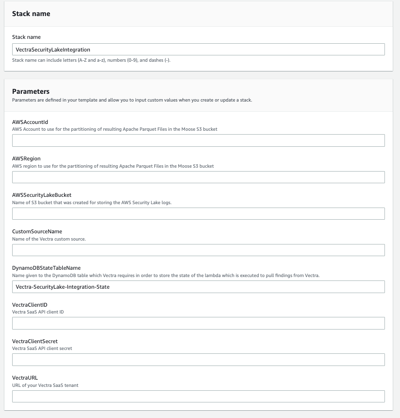 The AmazonSecurityLakeS3Bucket and AmazonSecurityLakeS3BucketPrefix should match what you created for the custom data source in Amazon Security Lake for Vectra.