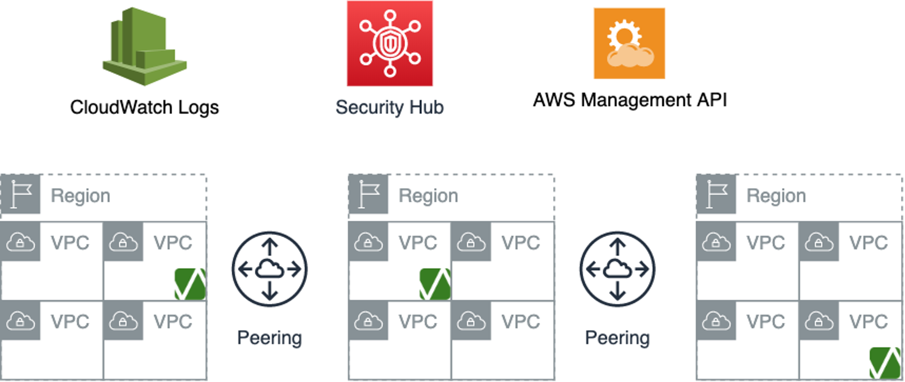 This is an expanded architecture from the example above. In this architecture, we added some more VPCs, some VPC Peering Connections and Routes to allow all the VPCs to communicate. However, we only added two Sensors to the four new VPCs: