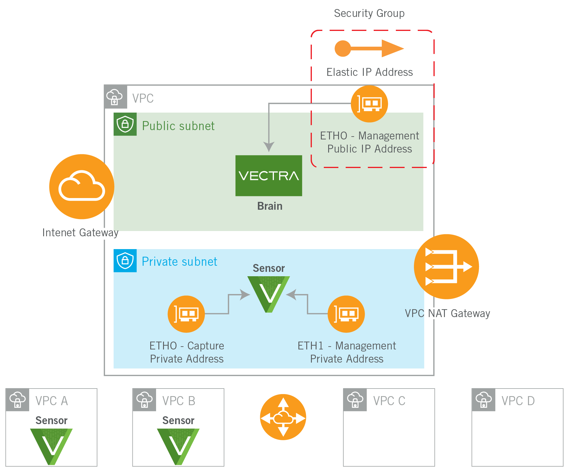 The Vectra Brain itself functions similarly when deployed on-premises and in the Public IaaS Cloud. However, collection of the packet data required is quite different. When deployed on-premises, Vectra uses physical and/or virtual Sensors to collect packet data from network taps or spans. In the Public Cloud Vectra can’t use physical taps and spans as they are not available. Instead, the options are: