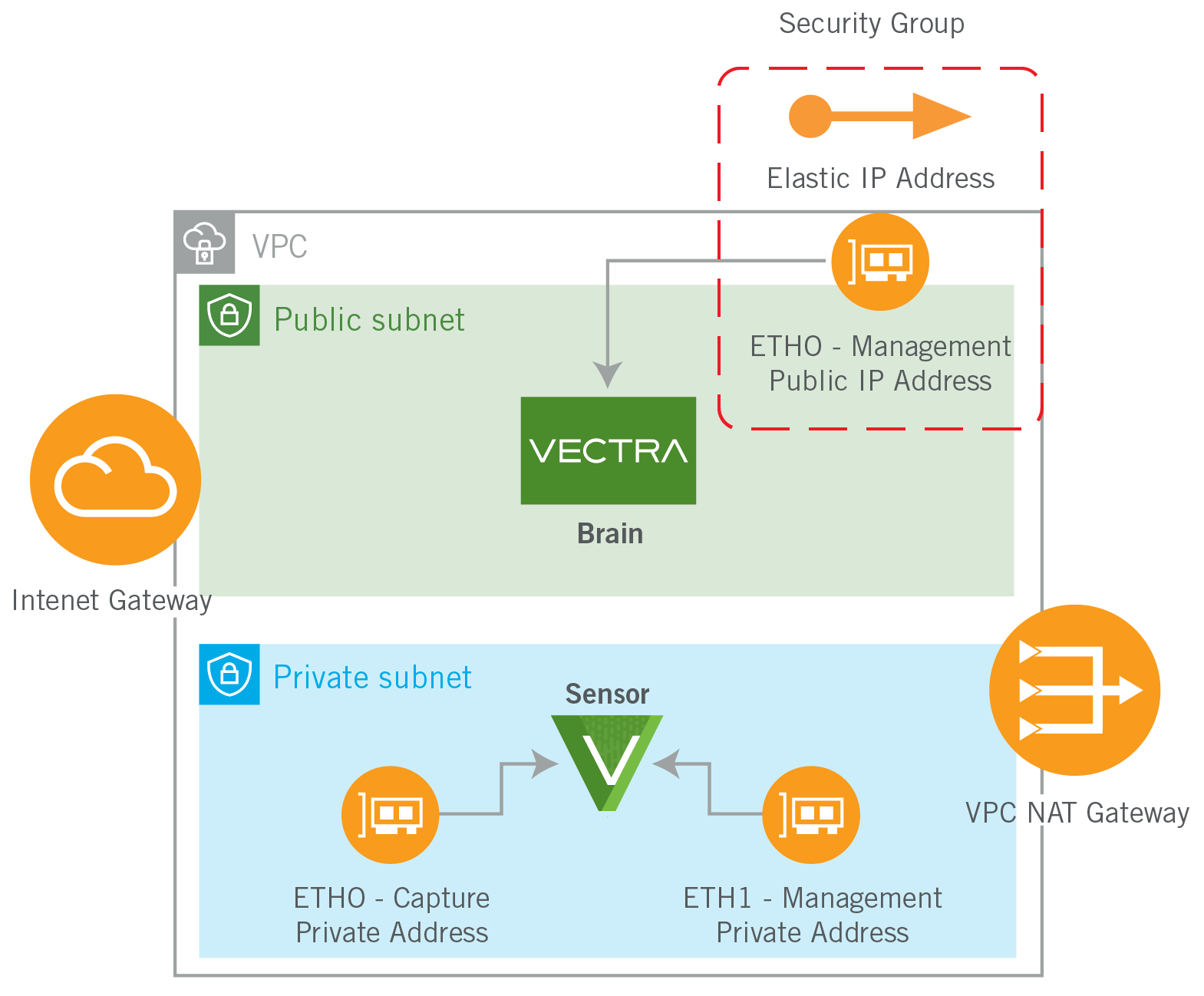 In this example there is a NAT gateway to allow outgoing connections from the Brain.