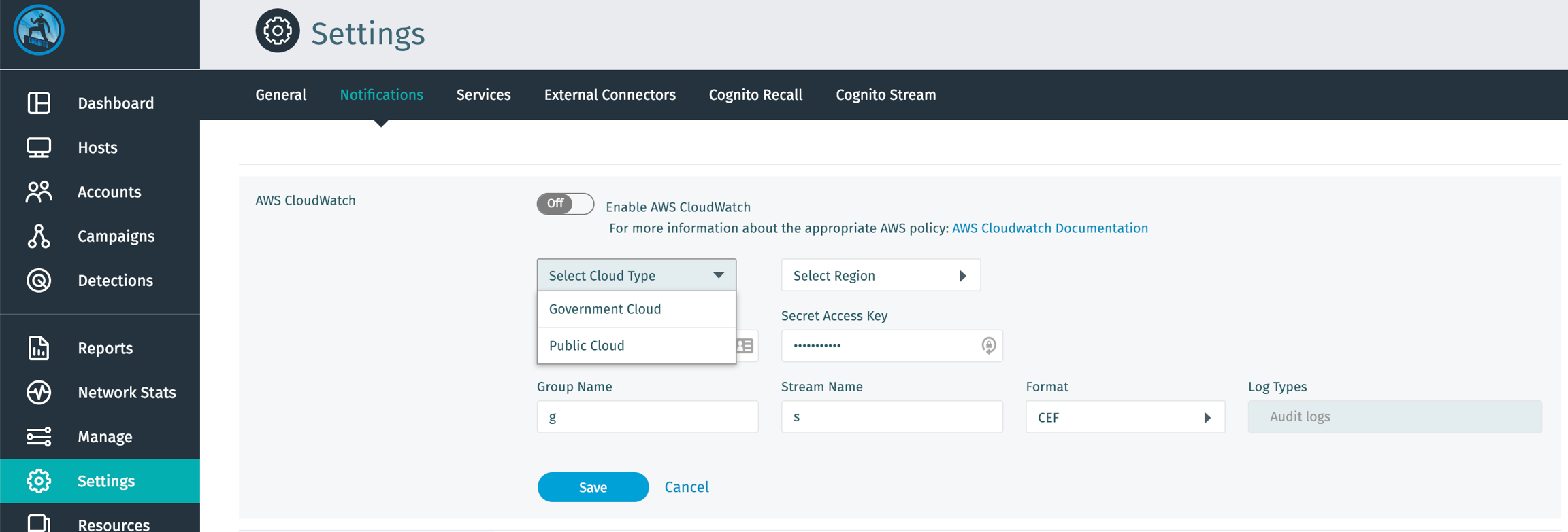 Navigate on the Vectra UI to Configuration → RESPONSE > Notifications > AWS CloudWatch.