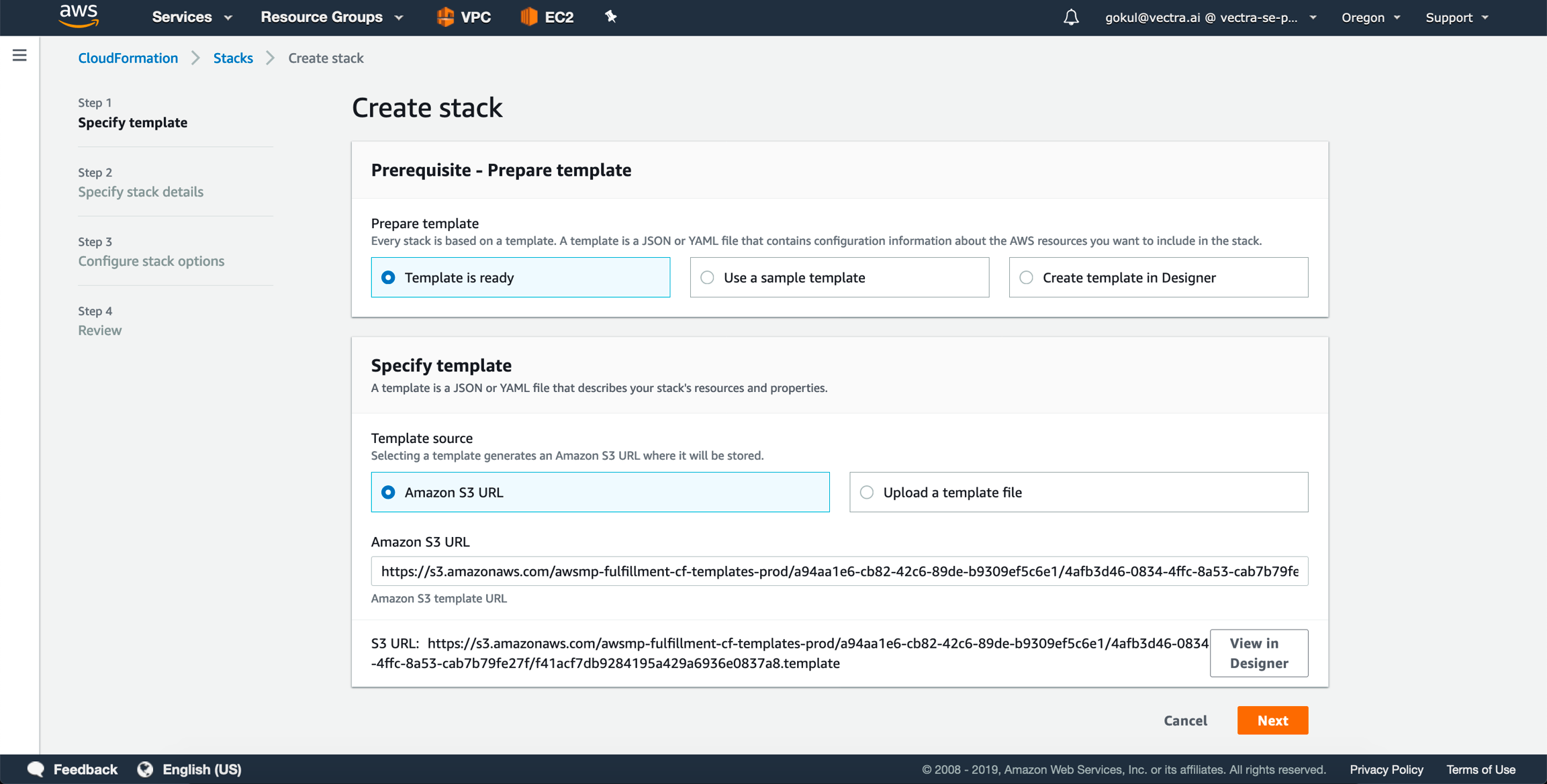 You will be presented the AWS CloudFormation screen pre-populated with the Template and Amazon S3 URL for the Vectra Sensor AMI.