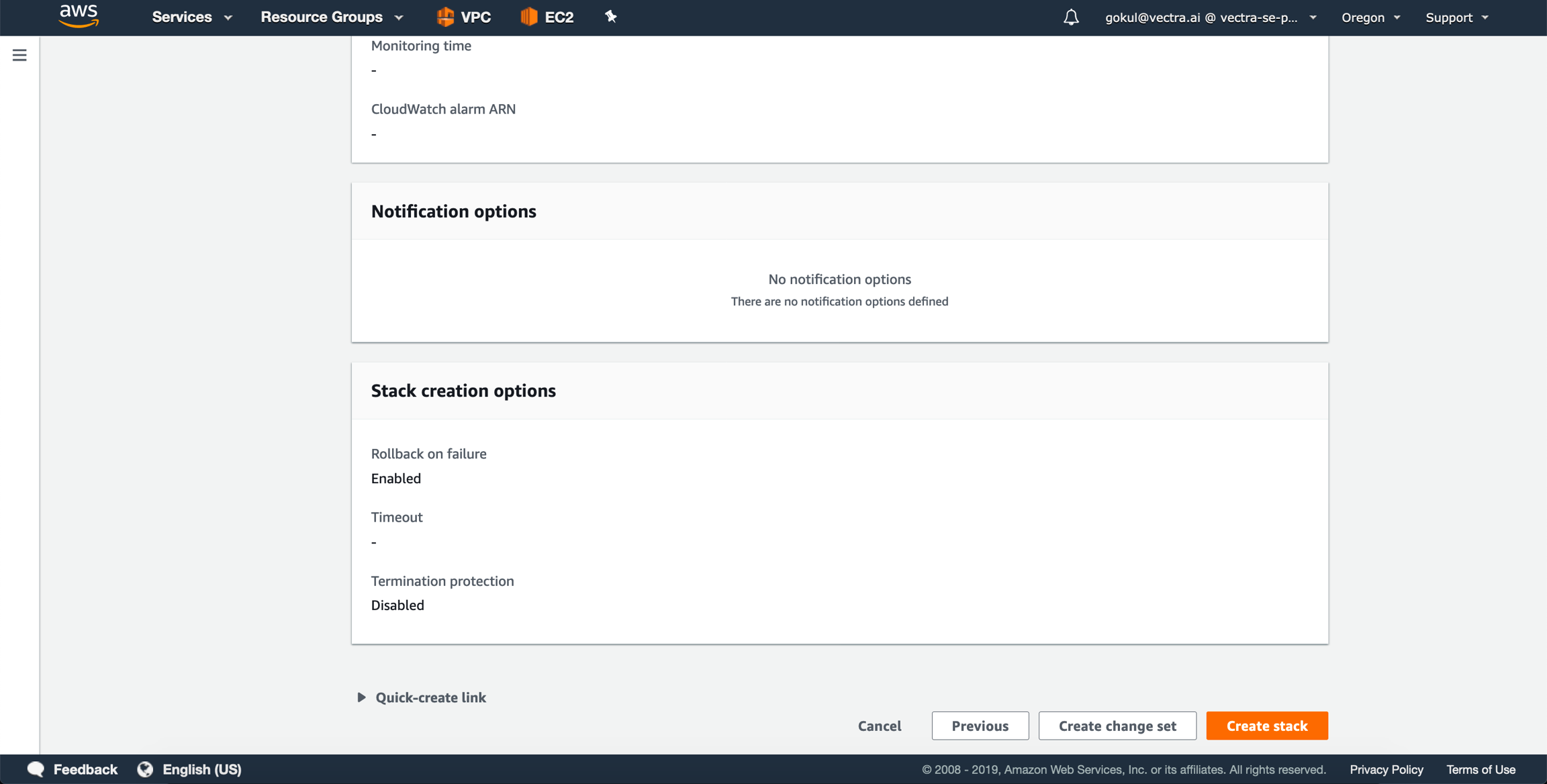 Stack name - The Stack name must be unique and can contain letters, numbers, and dashes only.
