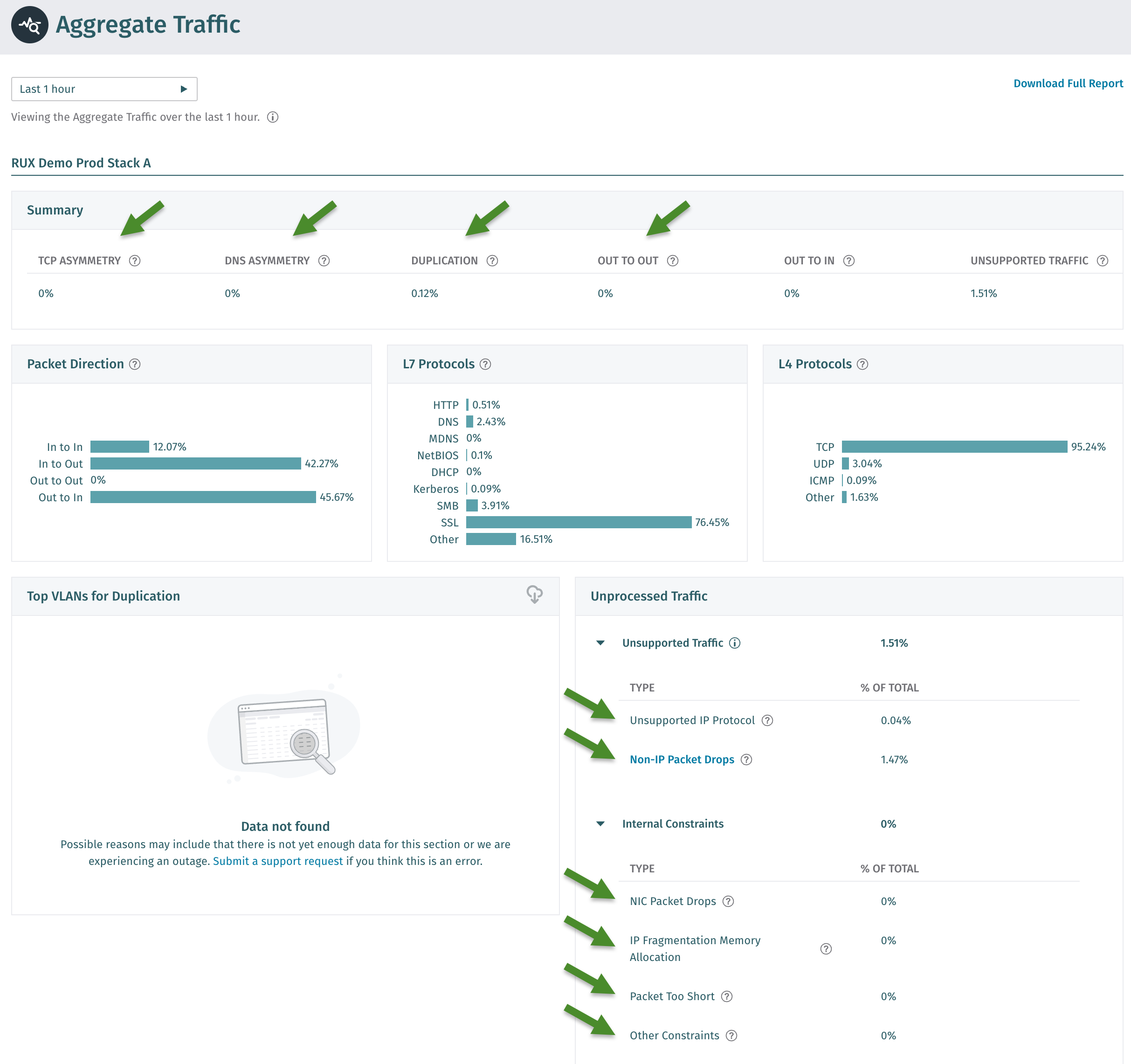 This metric is located at *Network Stats → TRAFFIC VALIDATION → Aggregate Traffic → Unprocessed Traffic → Unsupported Traffic* and is known as `unsupported_ip_proto_drops_pct` at the command line.